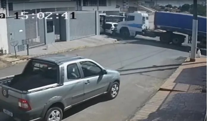 Imagens de câmeras de segurança flagraram o momento exato do acidente, por volta das 15h, é possível ver quando a carreta desce a rua e arrasta o veículo e o portão da residência.