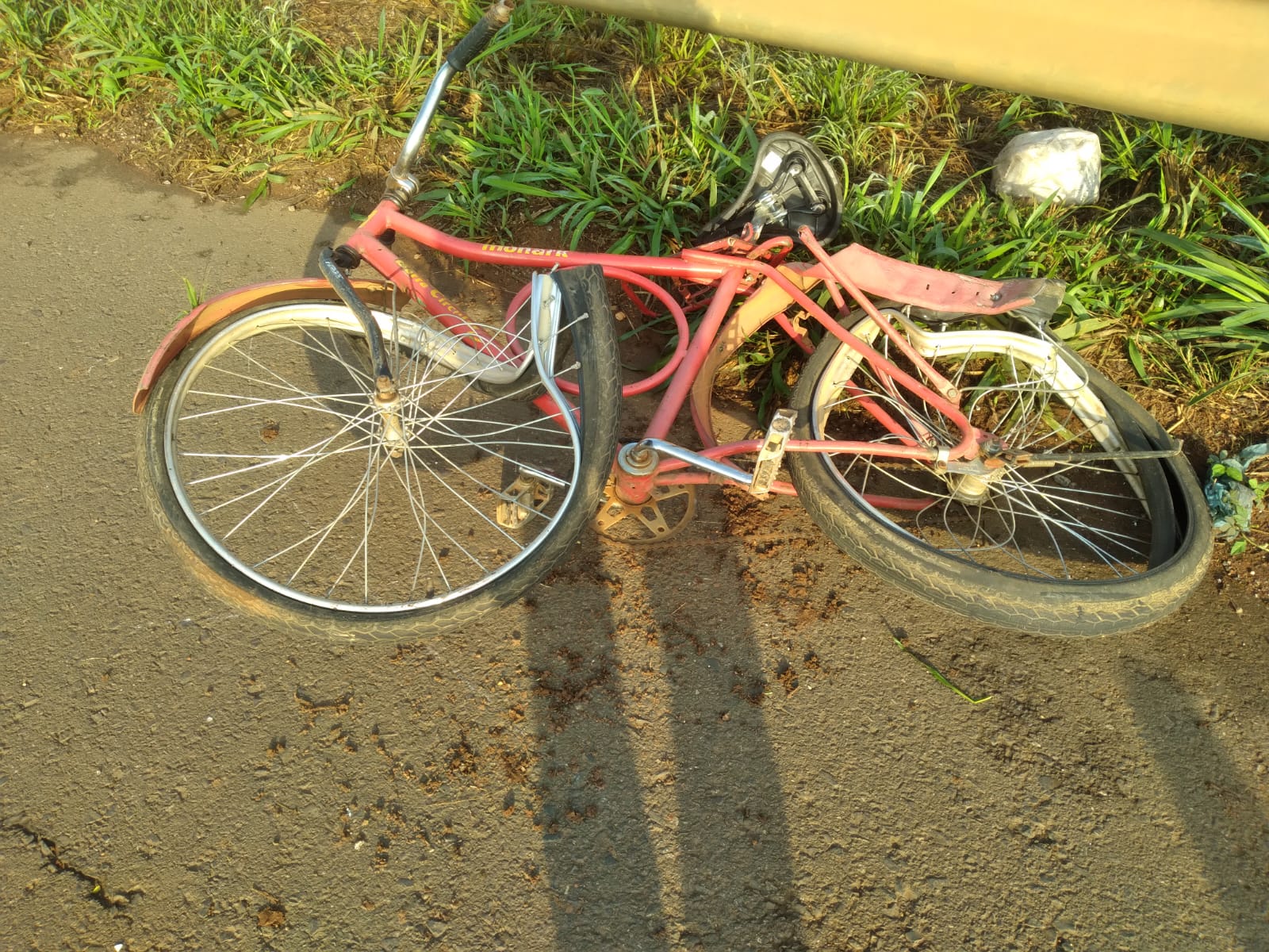 A bicicleta foi atingida pelo para-choque dianteiro do caminhão do lado direito