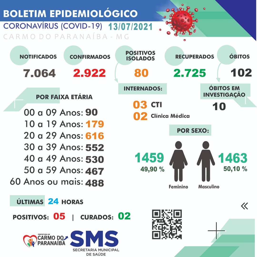 Ao todo 7.064 casos notificados, destes, 2.922 positivados com 2.725 curados.