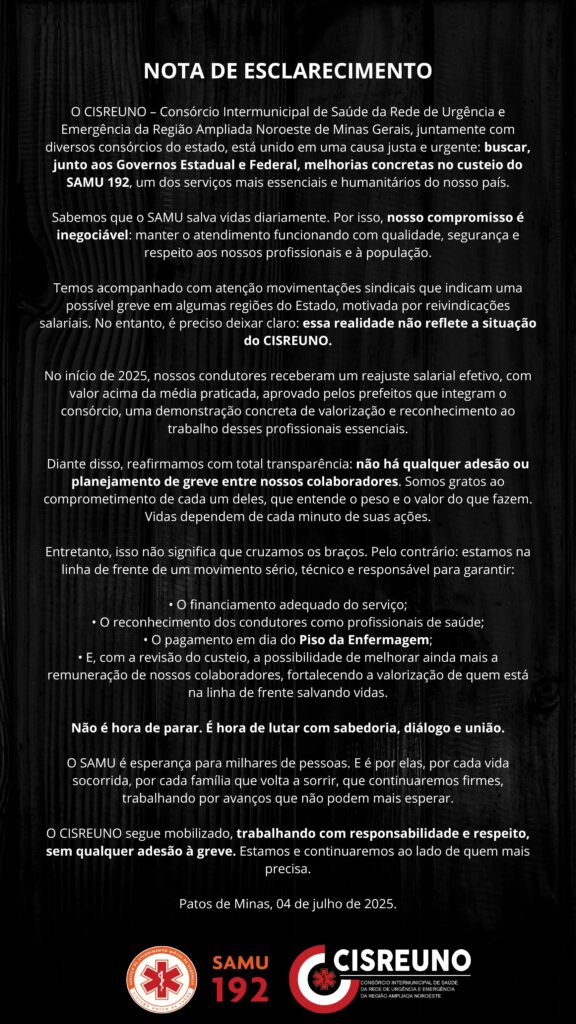 O CISREUNO – Consórcio Intermunicipal de Saúde da Rede de Urgência e Emergência da Região Ampliada Noroeste de Minas Gerais – está unido a diversos consórcios do estado em uma mobilização séria e urgente para garantir melhorias no custeio do SAMU 192. O objetivo é claro: cobrar dos Governos Estadual e Federal medidas concretas para assegurar a continuidade e a qualidade de um dos serviços mais essenciais e humanitários do país.