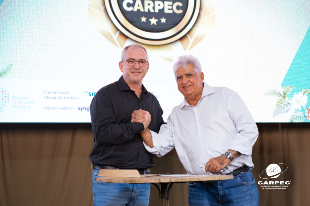 O Presidente da CARPEC, Sr. Tarcísio Daniel, e o Presidente do Conselho de Administração do Sicoob Credicarpa, Sr. Lisandro Coutinho Borges, assinaram no palco um termo de cooperação para financiar a construção e ampliação de terreiros, bem como a aquisição de máquinas e equipamentos. CARPEC e Sicoob Credicarpa construindo através da intercooperação um futuro mais promissor para o café de qualidade.