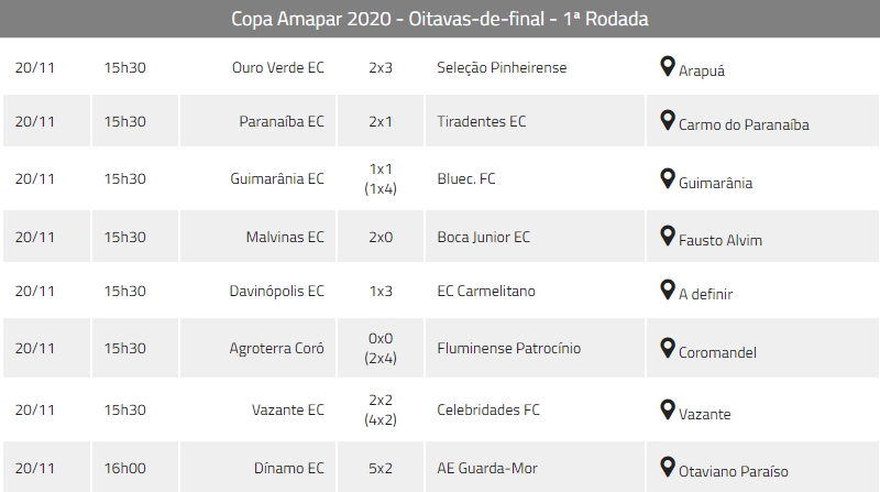 A definição dos confrontos das Quartas de Final somente será informado na próxima segunda-feira. Até este momento estão classificados as equipes do Paranaíba, Dínamo, Vazante, Malvinas, Carmelitano, Fluminense Patrocínio, Seleção Pinheirense e Bluec.
