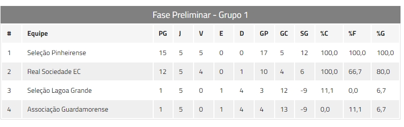 O grupo 1 já está com com situação definida. Seleção Pinheirense e Real Sociedade já estão classificados.