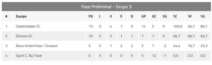 O grupo 3 já está com a seus classificados definidos. Celebridades e o Dínamo já estão classificados enquanto o Novo Andorinhas e o Na Trave já não tem mais chances de classificação.