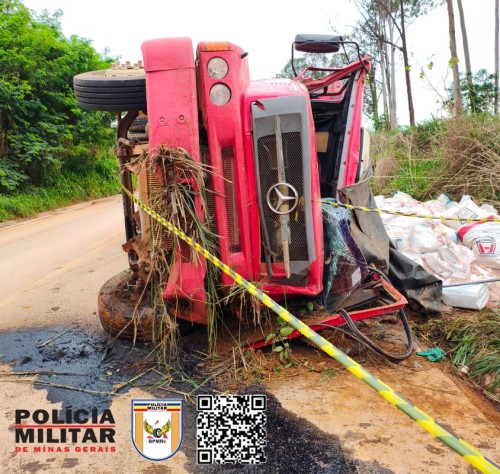 Chegando ao local os militares depararam com o caminhão Mercedes Benz/1620, tombado sobre a pista de rolamento.