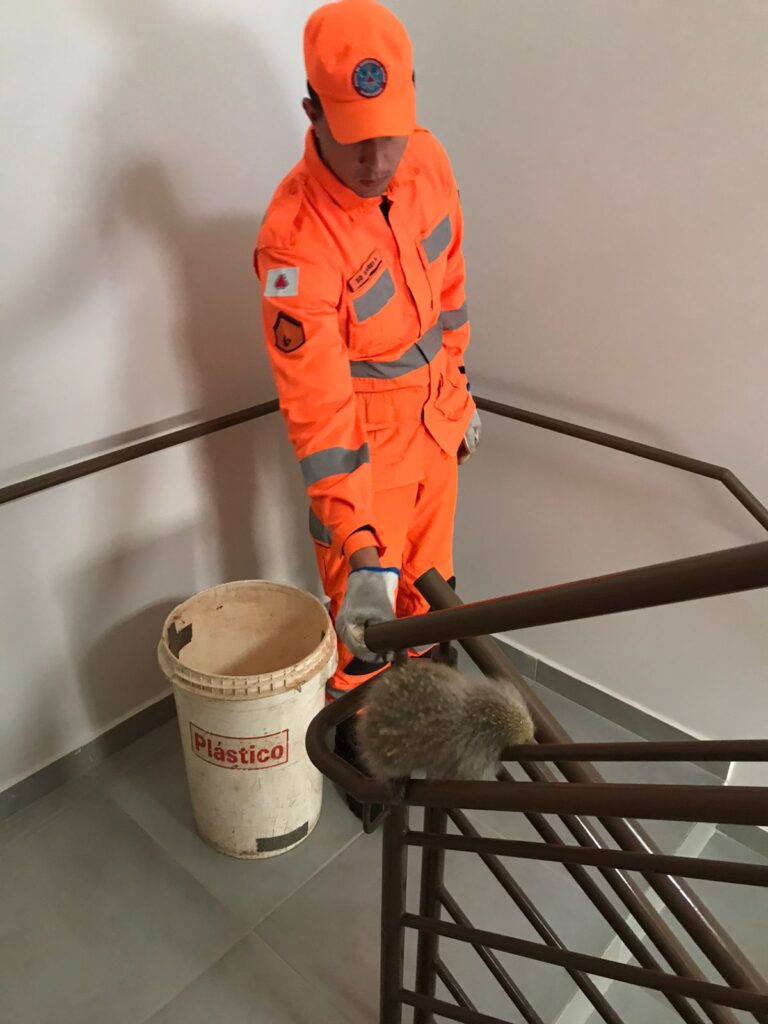 Ao chegarem no local informado pelos solicitantes, os bombeiros depararam com um ouriço-cacheiro que estava no 4º andar de um prédio localizado no bairro Laranjeira.