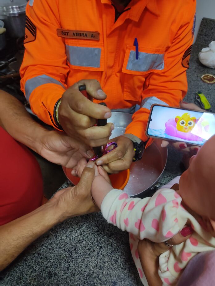 Segundo a mãe, antes de procurar os bombeiros, ela tentou remover o brinquedo utilizando água e sabão, mas não teve sucesso. O dedo da bebê ficou preso em uma das anilhas metálicas que compõem o brinquedo, dificultando a retirada.