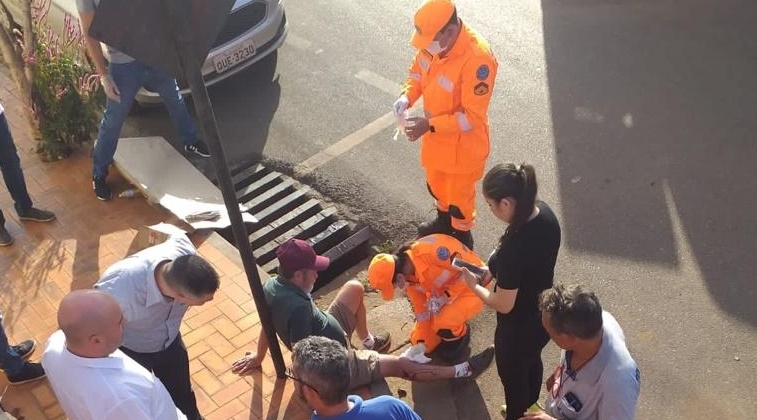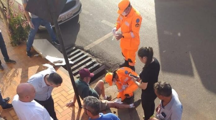 O idoso tentava atravessar a rua quando pisou em falso e caiu com a perna direita no bueiro da Rua Formiga, esquina com a Rua José Pereira da Fonseca, no Bairro Rosário. Ele ficou com a perna presa entre a ferragem e o asfalto.