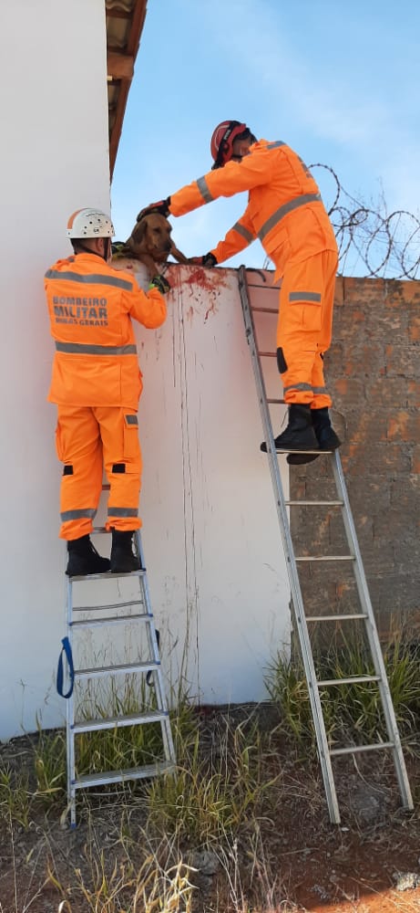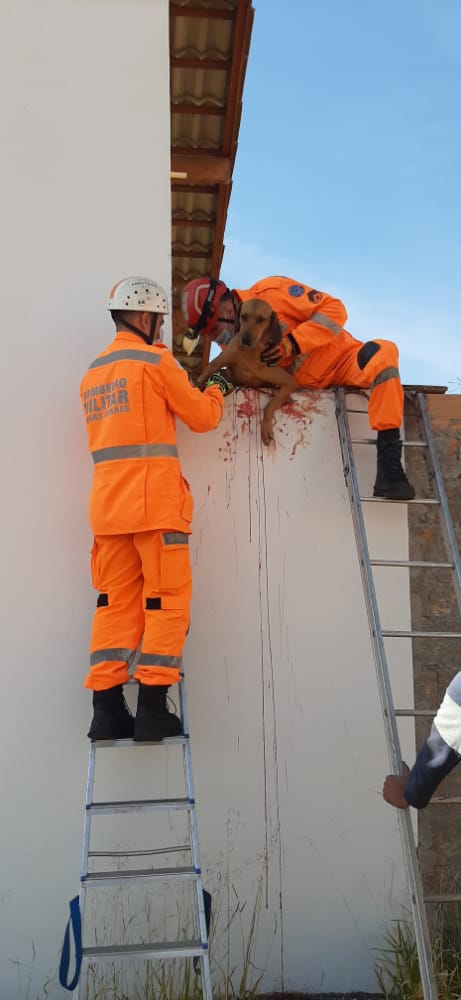 Os Bombeiros Militares de Araxá foram acionados na manhã desta quarta-feira (04/08), em uma residência no bairro Jardim Europa V para resgatar um cão que, provavelmente, ao tentar escalar o muro da residência ficou preso na concertina.