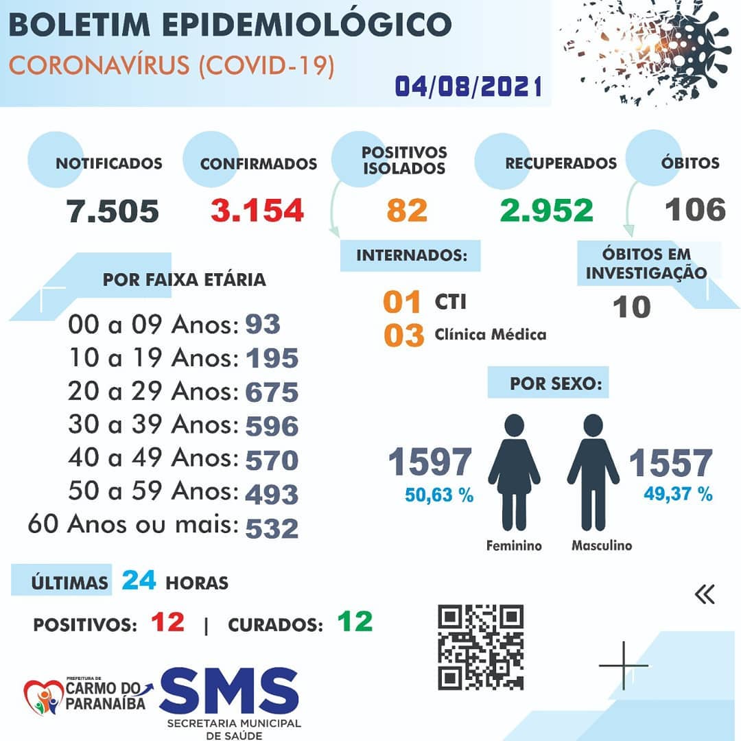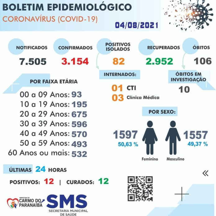 De acordo com o boletim epidemiológico desta quarta-feira (04), são 82 casos positivos isolados, um internado em CTI e outros três em clínica médica.