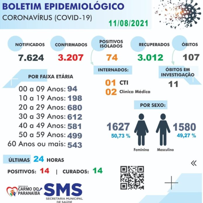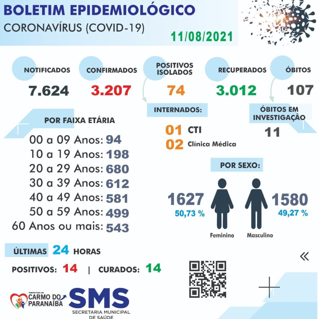 Ao todo 7.624 casos notificados, destes, 3.207 positivados com 3.012 curados.