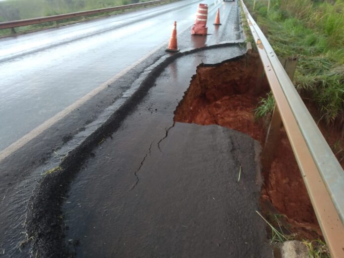 Nossa reportagem esteve no local no final da tarde desta sexta-feira (23/12) e, debaixo de chuva, gravou um vídeo do imenso buraco. Na filmagem é possível ver parte da terra se deslocando e descendo com a enxurrada. Em seguida, entramos em contato com a Polícia Militar Rodoviária para saber se alguma iniciativa seria tomada por parte da corporação, por exemplo, a interdição parcial da pista, mas ainda estamos aguardando resposta.