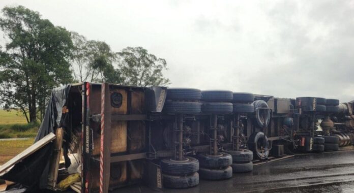 Os militares do Corpo de Bombeiros foram acionados na manhã deste domingo (15), por volta das 08h, para atender um tombamento de carreta no entroncamento do trevo da BR-365 com a MG-230.