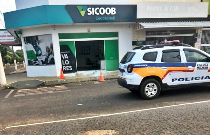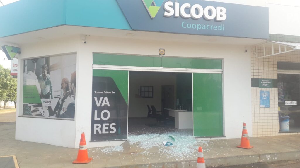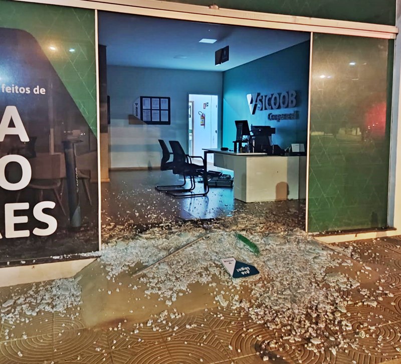 Posteriormente os bandidos arrebentaram a porta da agência Sicoob, localizada também no perímetro da praça. Na agência os bandidos fizeram um rastro de destruição, danificando portas, equipamentos, contudo, o local não possui cofres, não sendo levado nenhum valor em dinheiro.