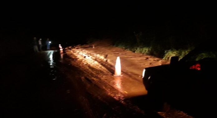 Com as recentes chuvas, um barranco que fica às margens da rodovia acabou desabando e a terra se depositou na pista. O barro tornou o asfalto escorregadio, o que pode provocar acidentes.