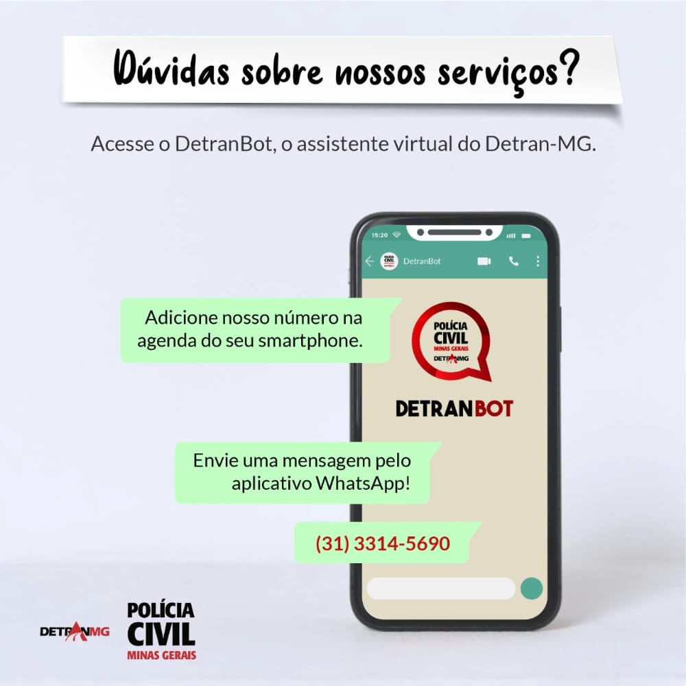 Para consultar o assistente virtual do Detran, é necessário que o usuário cadastre no celular o número do DetranBot (31)3314-5690, acesse o aplicativo Whatsapp e envie uma mensagem. O menu, com os temas disponíveis, será apresentado e o usuário poderá escolher a opção desejada, digitando em seguida o número do serviço pretendido.