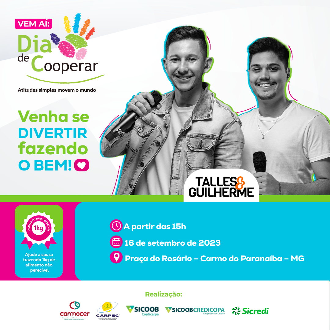 No dia 16 de setembro, será realizado o Dia de Cooperar, um evento social que reúne as cooperativas Carmocer, CARPEC, Sicoob Credicarpa, Sicoob Credicopa e Sicredi, com o propósito de proporcionar uma tarde de lazer em benefício da comunidade. O evento terá início às 15h, na Praça do Rosário, em Carmo do Paranaíba, e contará com show musical de Talles e Guilherme, além de gincanas, brincadeiras, praça de alimentação e outras atrações.