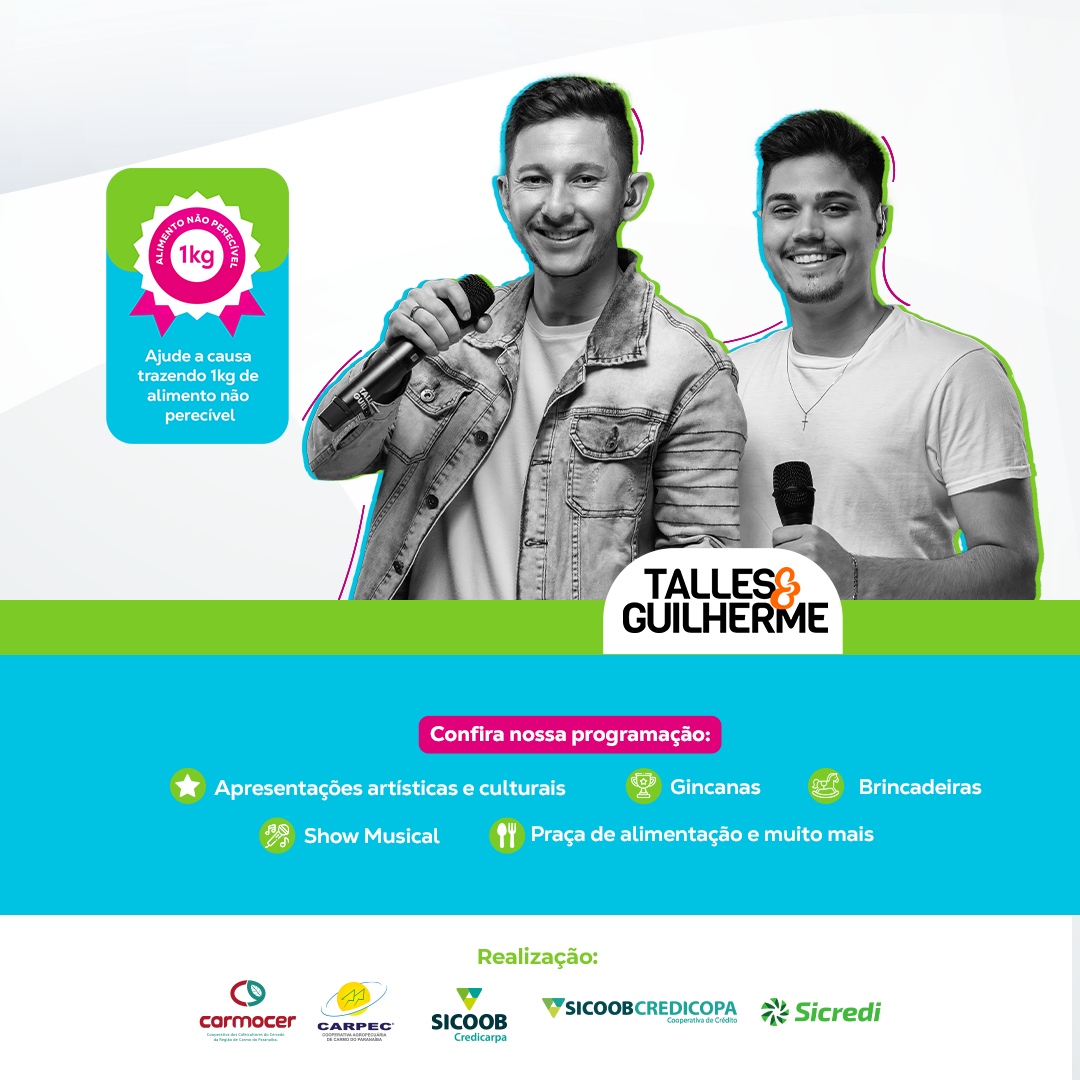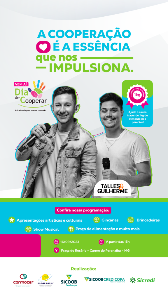 No dia 16 de setembro, será realizado o Dia de Cooperar, um evento social que reúne as cooperativas Carmocer, CARPEC, Sicoob Credicarpa, Sicoob Credicopa e Sicredi, com o propósito de proporcionar uma tarde de lazer em benefício da comunidade. O evento terá início às 15h, na Praça do Rosário, em Carmo do Paranaíba, e contará com show musical de Talles e Guilherme, além de gincanas, brincadeiras, praça de alimentação e outras atrações.