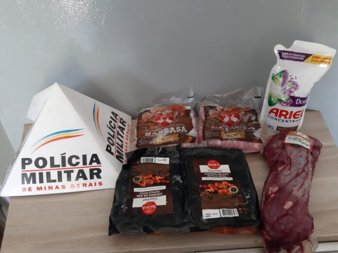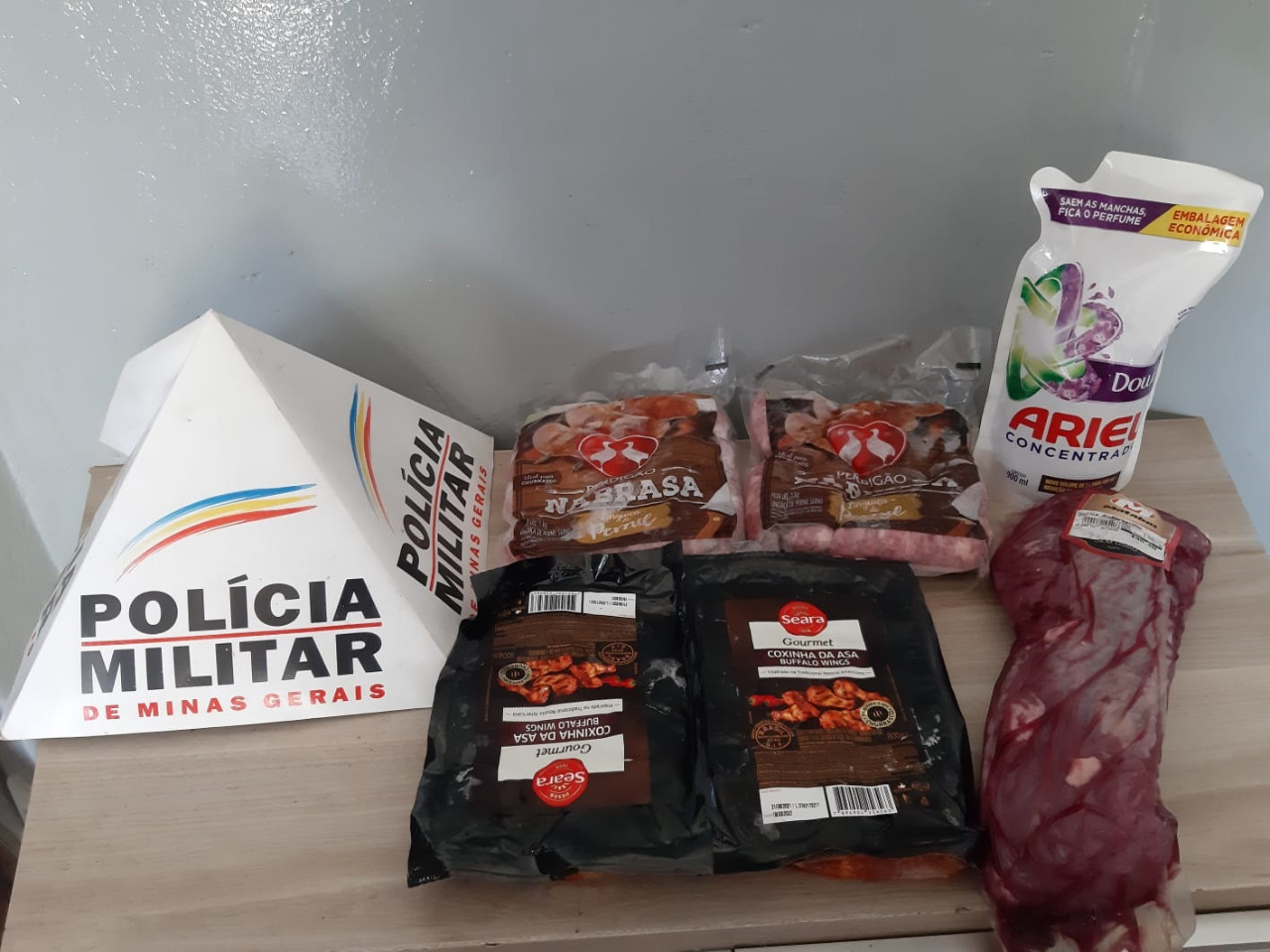 No veículo das suspeitas foram localizados os produtos furtados, sendo cinco pacotes de carnes diversas e um frasco de sabão líquido.