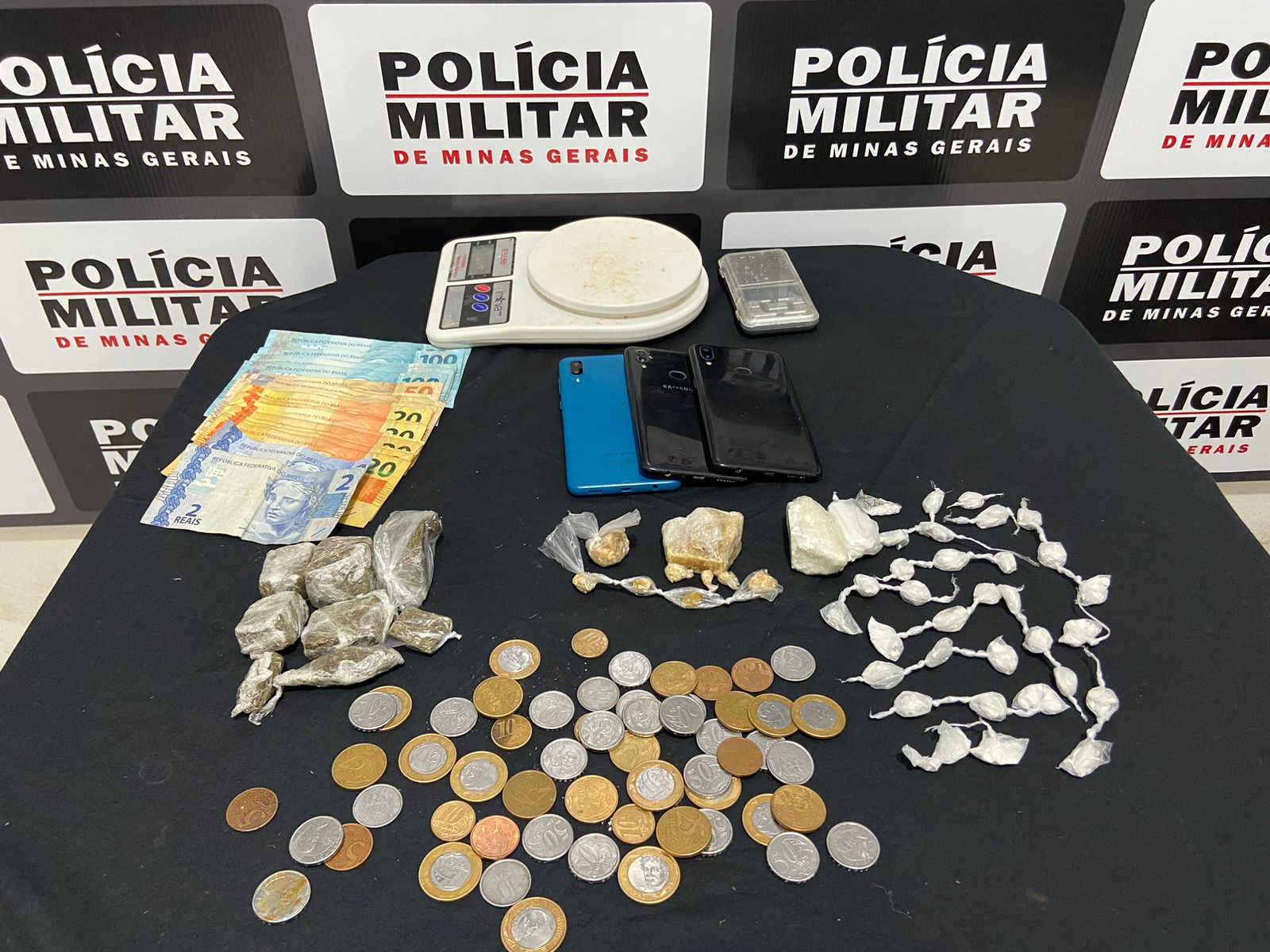 Com isso, as equipes foram até a residência do traficante e, por cima do muro, visualizaram vasilhas com cocaína, crack e maconha. Assim que entraram na casa, na presença do morador, foi encontrada também a quantia de R$1.374,00 em dinheiro, balanças usadas para pesagem de entorpecentes e vários telefones celulares.