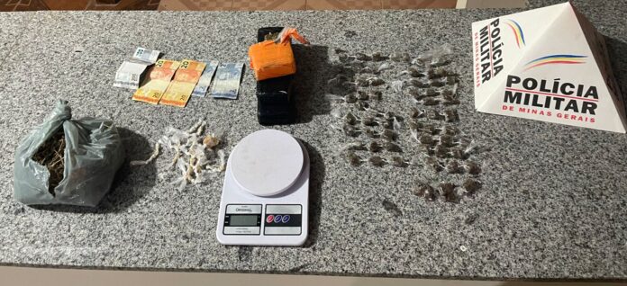 Na residência, os policiais localizaram uma barra de maconha inteira, três tabletes fracionados e mais sessenta buchas da droga, setenta pedras pequenas de crack e uam pedra da substância sem fracionar, um saco plástico contendo folhas, galhos e sementes de maconha, uma balança de precisão e 244 reais em dinheiro.