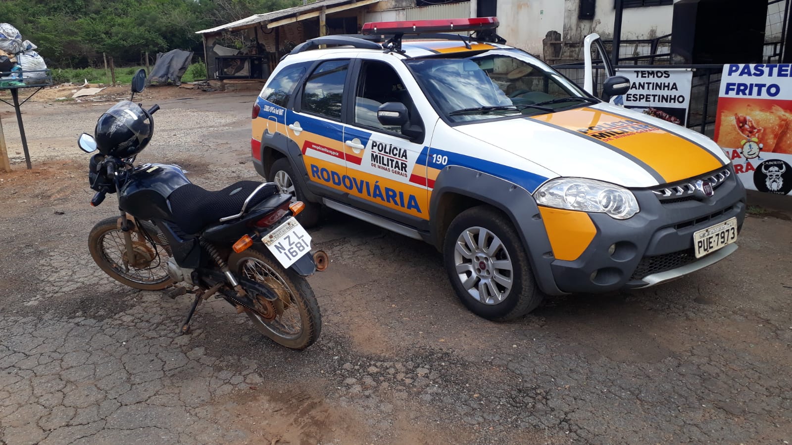 Durante a fiscalização foi constatado que o chassi estava picotado e estava utilizando uma placa artesanal de plástico adesivada com tamanho, cor e fontes similares as oficiais com caracteres “NZL-1681”, o qual pertence ao automóvel Renault Sandero do estado da Bahia.O número de motor pertence à motocicleta placa “NLZ-1681”.