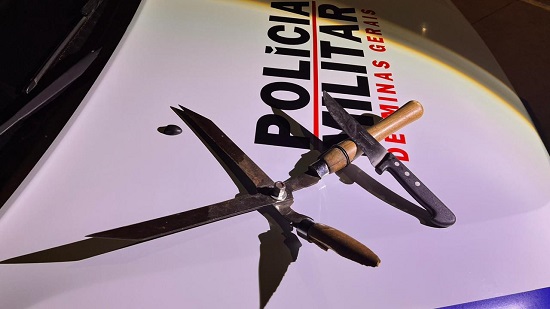 O militar então distanciou-se dele para tentar novamente a verbalização e a quebra da resistência, contudo o suspeito atirou a tesoura de jardinagem contra o militar atingindo o mesmo na perna, na altura da panturrilha causando quatro perfurações.