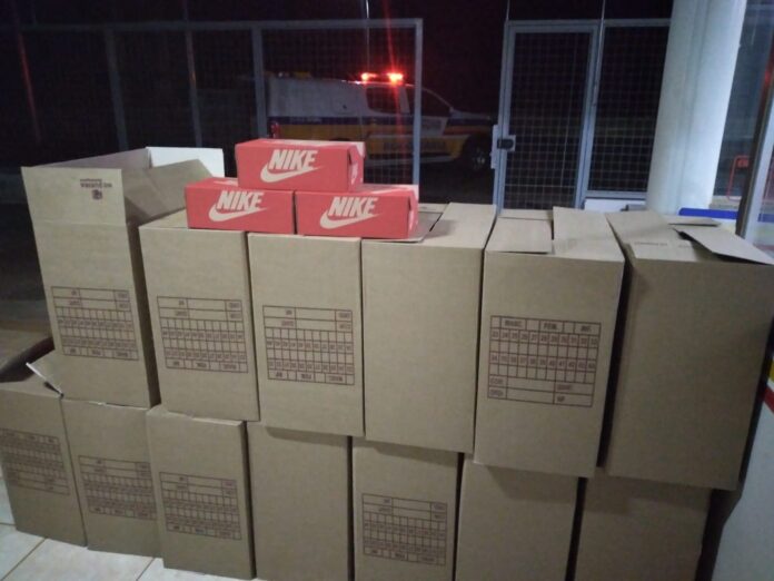 Durante a fiscalização no interior do veículo, foram localizados 13 caixas de papelão nas quais continham em seu interior 195 pares de tênis falsificados da marca “nike”, sem nota fiscal ou documentos que comprovassem a origem.