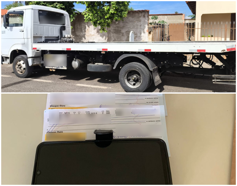 Durante a abordagem, foram apreendidos cheques falsificados, um telefone celular e um caminhão, que seria utilizado para o transporte de um equipamento agrícola.