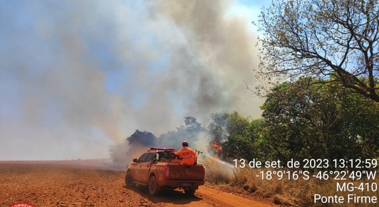 O Corpo de Bombeiros de Patos de Minas combate nesta quarta-feira (13) um incêndio de grandes proporções em uma fazenda no Distrito de Ponte Firme, no município de Presidente Olegário. O fogo já queimou duzentas hectares. Bombeiros e brigadistas usam máquinas e equipamentos na tentativa de conter as chamas. Além do tempo seco, o vento dificulta a ação dos militares.