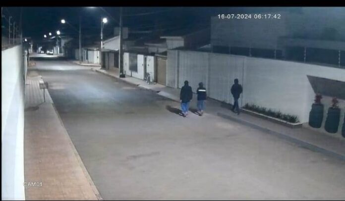 Dando sequencia as diligências, os militares com apoio da Polícia Civil tiveram acesso a câmeras de segurança e visualizaram dois autores chegando ao local numa motocicleta, cor vermelha, no início da madrugada. As imagens mostram o passageiro descendo da moto segurando um alicate de corte, subindo em um poste de iluminação e cortando parte da uma cerca de concertina do muro da casa e, em seguida, ambos deixaram o local.