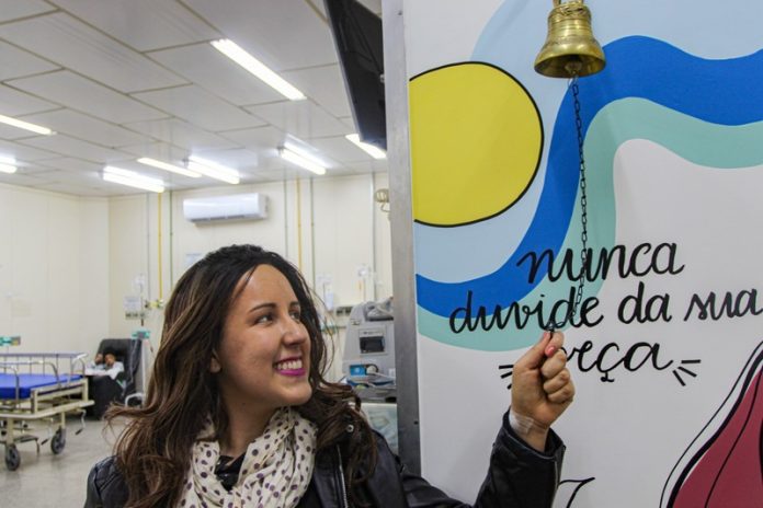A prática de tocar o sino no HAC – referência estadual em oncologia, teve início na antiga sala de infusão da unidade em setembro de 2020 e foi temporariamente interrompida, no ano passado, para que o setor ocupasse uma área maior e mais confortável para os pacientes. Com a mudança, a parede do sino ganhou uma pintura especial realizada pela artista plástica Thaís Aguiar e uma frase de incentivo: “nunca duvide da sua força”.