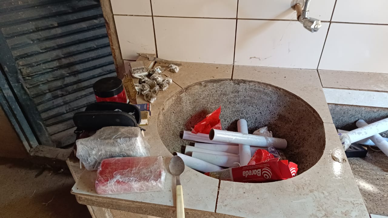 Além disso, durante as buscas pelo suspeito do furto, os policiais civis localizaram, em uma residência abandonada no Bairro Babilônia, grande quantidade de maconha e cocaína, munições de arma de fogo, dois rádios portáteis e um celular, o que pode auxiliar a Polícia Civil quanto à identificação do proprietário das drogas e munições localizadas.
