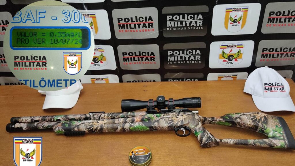 Porém, durante a busca veicular, no banco de trás, foi encontrada uma carabina marca PCP FOX M25, de gás comprimido, calibre 6,35mm, além de um recipiente contendo munições do mesmo calibre. A arma é considerada de uso restrito, pelo novo Decreto n° 11.615 de 21 de julho de 2023.