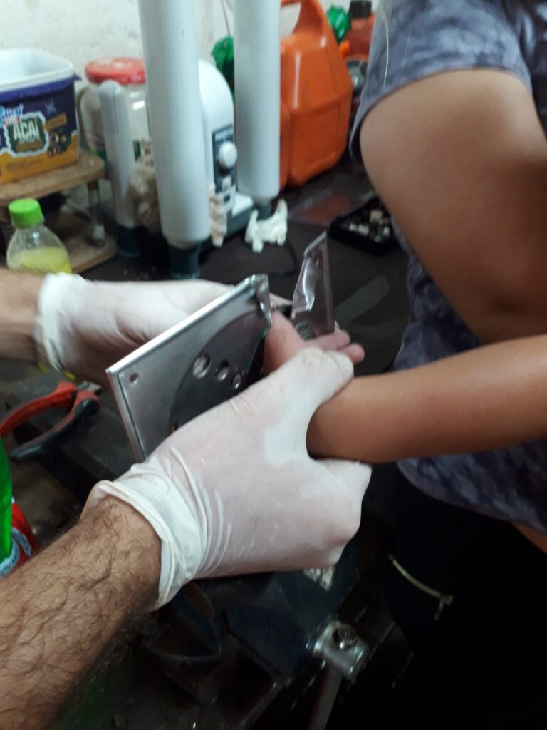 Com técnica e persistência, os bombeiros conseguiram desmembrar as chapas e, em seguida, cortar uma de cada vez até liberar o o dedo da criança.