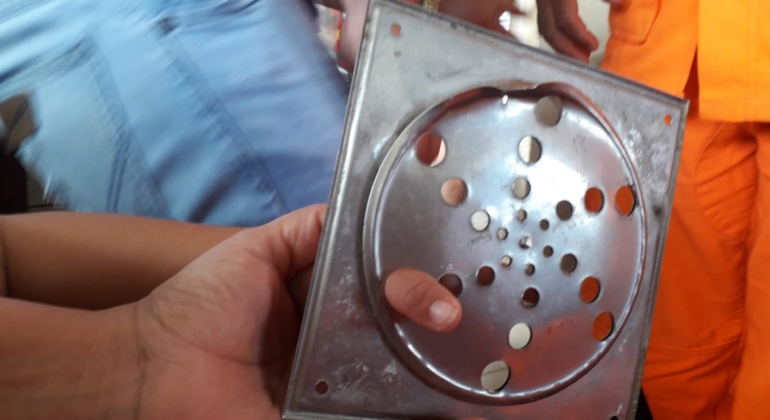 Os bombeiros informaram ainda que a ocorrência teve um complicador visto que o ralo era composto de duas chapas de aço inox, um material muito resistente, e não era possível utilizar ferramentas pesadas durante os trabalhos, pois havia o risco de ferir ou fraturar o dedo da criança.