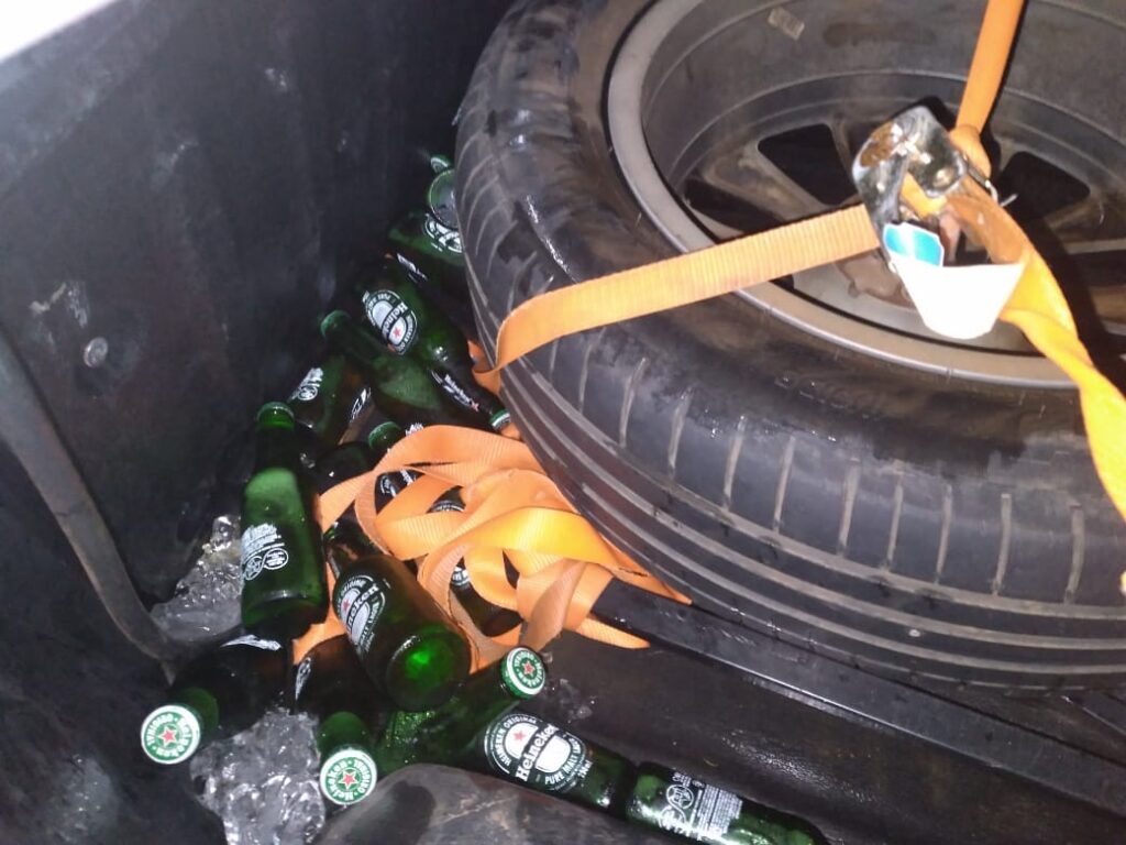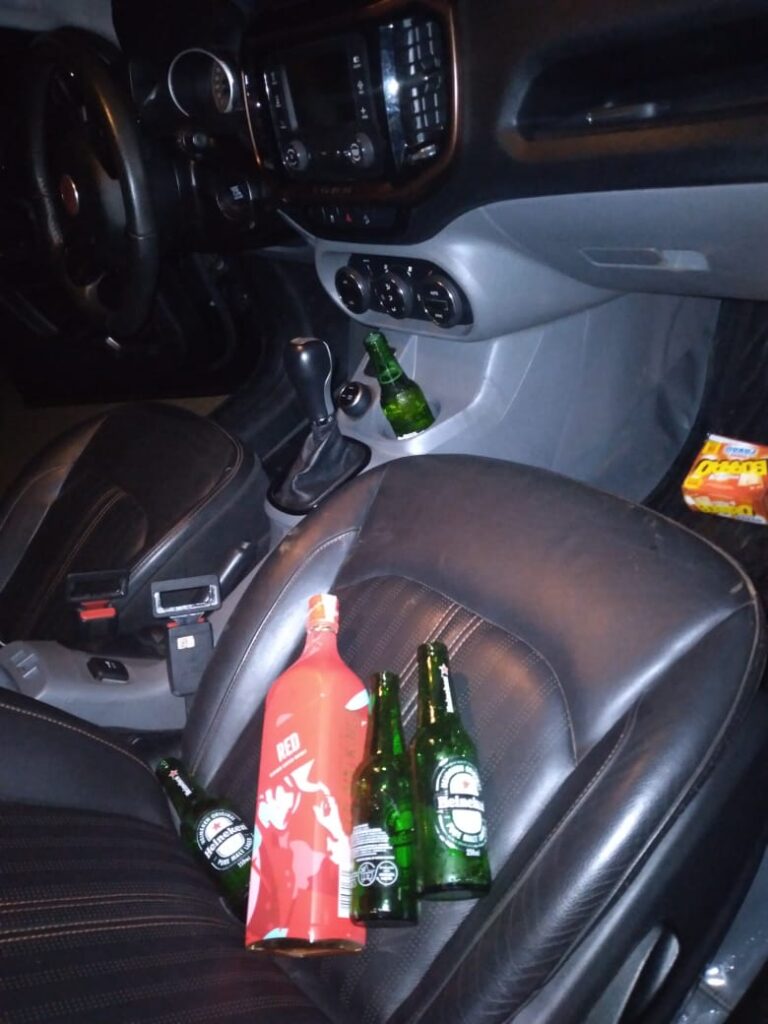 Por fim, no interior do veículo, foram encontrados três garrafas de cerveja Heineken vazias, uma parcialmente cheia, um litro de bebida destilada vazio e no compartimento de carga vinte e sete garrafas de cerveja cheias com gelo.
