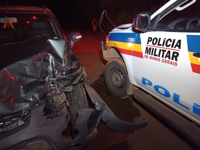 Na noite desta terça-feira (27/12), uma viatura da Polícia Militar realizava uma abordagem a um carro quando foi atingida por uma picape. O acidente, uma colisão frontal, aconteceu na estrada da Serrinha.