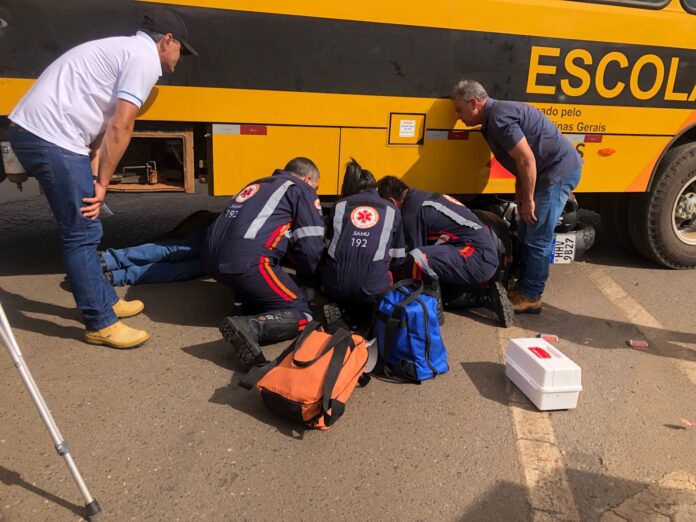 A motocicleta e o condutor acabaram parando debaixo do ônibus.