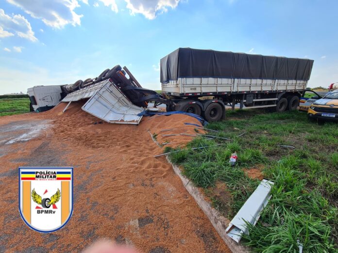 A carga de sorgo em grãos a granel ficou espalhada na pista, interrompendo parcialmente o fluxo de veículos.
