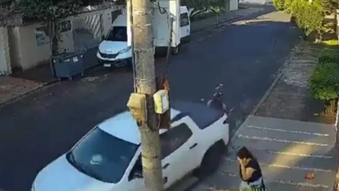 Um bandido em uma moto foi atropelado por uma caminhonete enquanto tentava roubar uma enfermeira na tarde de terça-feira (14), na Avenida Levindo de Souza, em Uberlândia. A ação foi flagrada por câmeras de segurança da via no Bairro Umuarama.