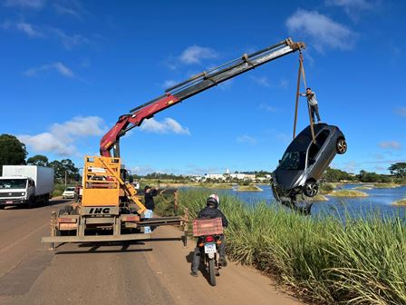 Com isso, o carro saiu da pista pelo lado direito e acabou avançando sobre uma represa localizada às margens da rodovia.