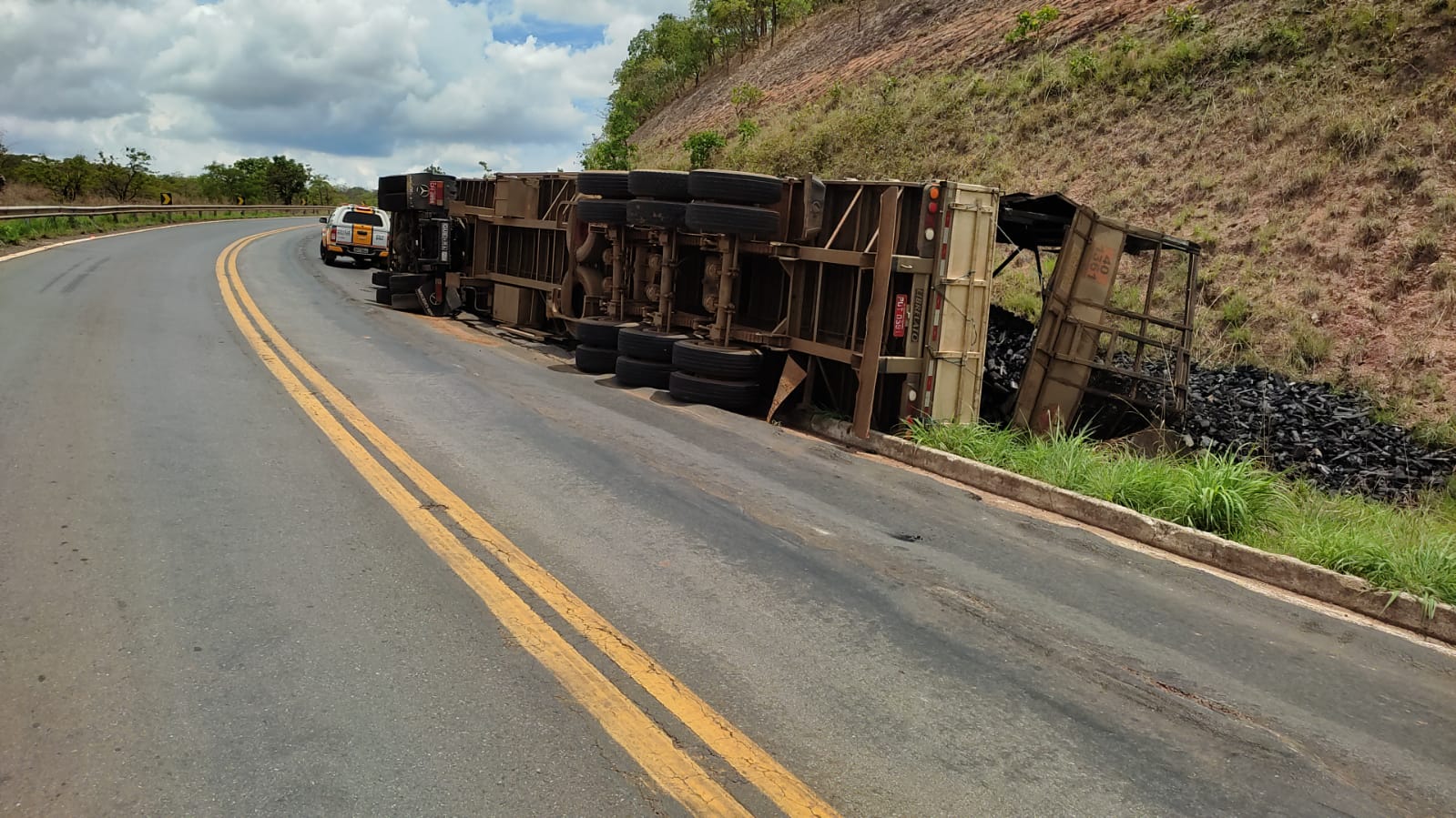 Na manhã desta quinta-feira (04-11), a Polícia Militar Rodoviária registrou um acidente de trânsito na Serra da Bela Vista no KM 25, da MG-410, município de Presidente Olegário. Ao chegarem no local, os militares depararam com uma combinação veicular carregado com carvão, emplacada em Presidente Olegário, tombada no acostamento da rodovia.