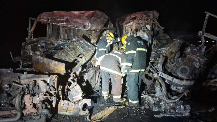 De acordo com a Polícia Rodoviária Federal (PRF), as carretas seguiam em sentidos opostos quando colidiram frontalmente. O impacto foi tão forte que as duas cabines dos veículos ficaram destruídas e pegaram fogo. O incêndio foi controlado com o auxílio de caminhões-pipas.