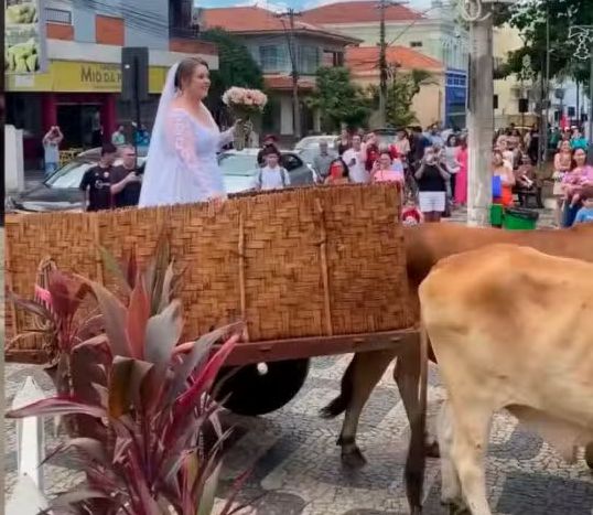 Quem passava pelas imediações do Santuário de Santa Rita de Cássia neste fim de semana esperava, talvez, ver a chegada de um carro de luxo ou uma entrada tradicional, mas foi surpreendido por um som inconfundível para quem ama a vida no campo: o ranger das rodas e o passo firme da boiada. O cenário urbano de Santa Rita do Sapucaí (MG) parou para assistir a uma cena que parecia saída de um filme de época, quando a noiva decidiu transformar seu grande dia em uma verdadeira homenagem às suas raízes, trocando o conforto convencional pela autenticidade de um carro de boi.