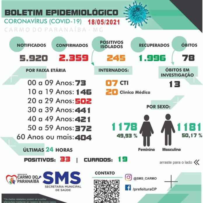 Ao todo 5.920 casos notificados, destes, 2.359 positivados com 1.996 curados.