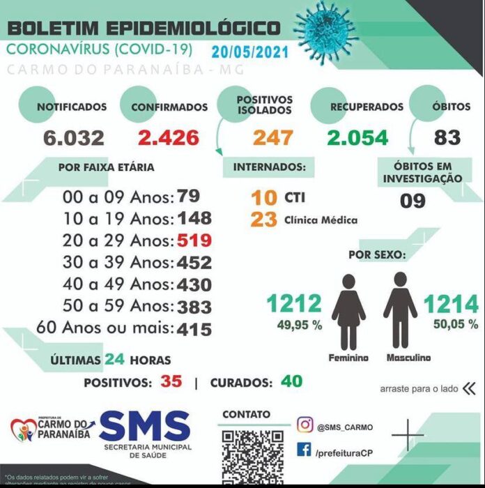 Ao todo 6.032 casos notificados, destes, 2.426 positivados com 2.054 curados.