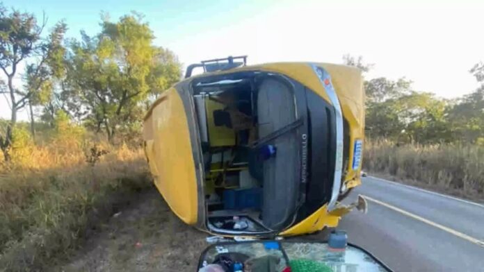 Um ônibus escolar que transportava moradores da cidade de Brasilândia de Minas atropelou uma anta e acabou tombando na pista da MG-410, no município de Lagoa Grande. O acidente ocorreu no início da manhã desta terça-feira (05/07).
