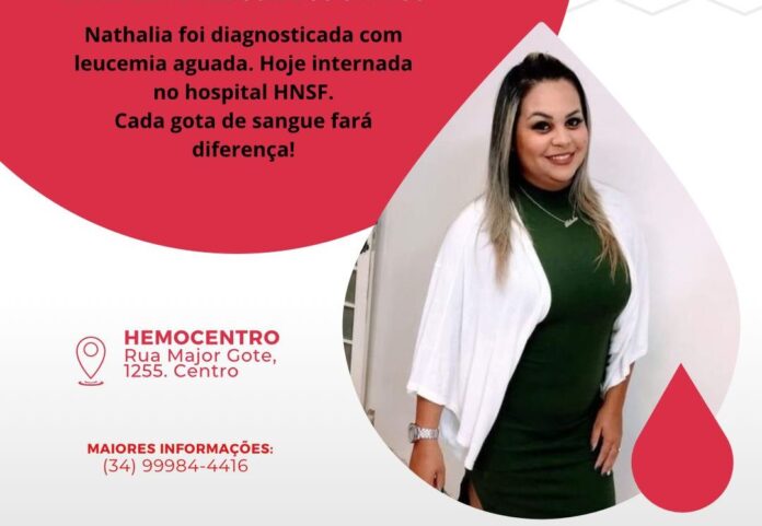 Nathalia Barbosa dos Santos, de 31 anos, foi diagnosticada com leucemia aguda. Nesta semana ela começara o tratamento de quimioterapia e precisará de doação de sangue, todo tipo sanguíneo é bem vindo.