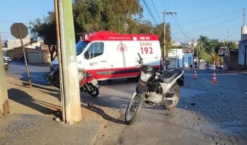 Duas motociclistas ficaram feridas após um acidente na Rua São Geraldo, em Patos de Minas. A colisão envolveu uma Honda NXR 160 Bros, de cor preta, e uma motoneta Honda Biz 125 ES, cor vermelha.